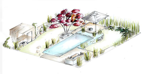Naturpool, Meditationsplatz, Feuerplatz und Licht-Inszenierung vereinen sich zu deinem